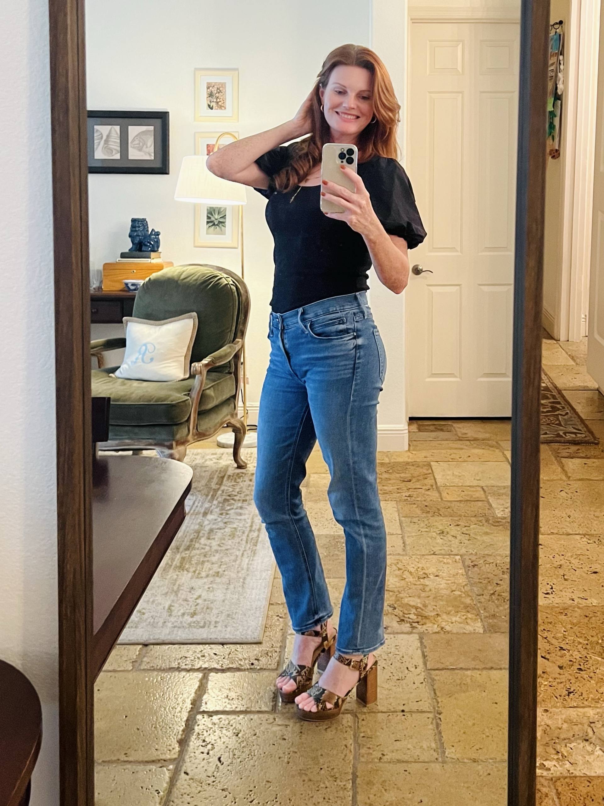 I wanted to wear my new rosary necklace that I recently bought.  It is gorgeous and looks so pretty with everything!  It’s by Marrin Costello, a Florida based jewelry designer.  I’m currently obsessed with all her pieces!  I bought several pieces for my nieces for Christmas!  I paired my favorite black puff top with my straight leg Mother jeans and added my leopard print platform sandals.  They are actually really comfortable to wear all day!  All together, I loved this simple, but elevated day time look.  The leopard shoes and the rosary necklace made it feel a little extra special!